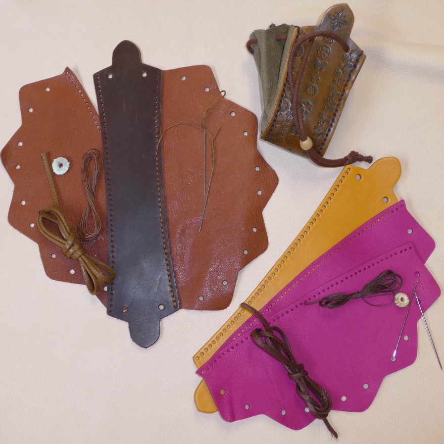 Bastelset ''Thorbeutel", pflanzlich gegerbtes Leder, Mittelstreifen ist punzierbar. Inhalt: 3 Stanzteile, 2 Nadeln, Garn und Zuziehband, Schiebeperle