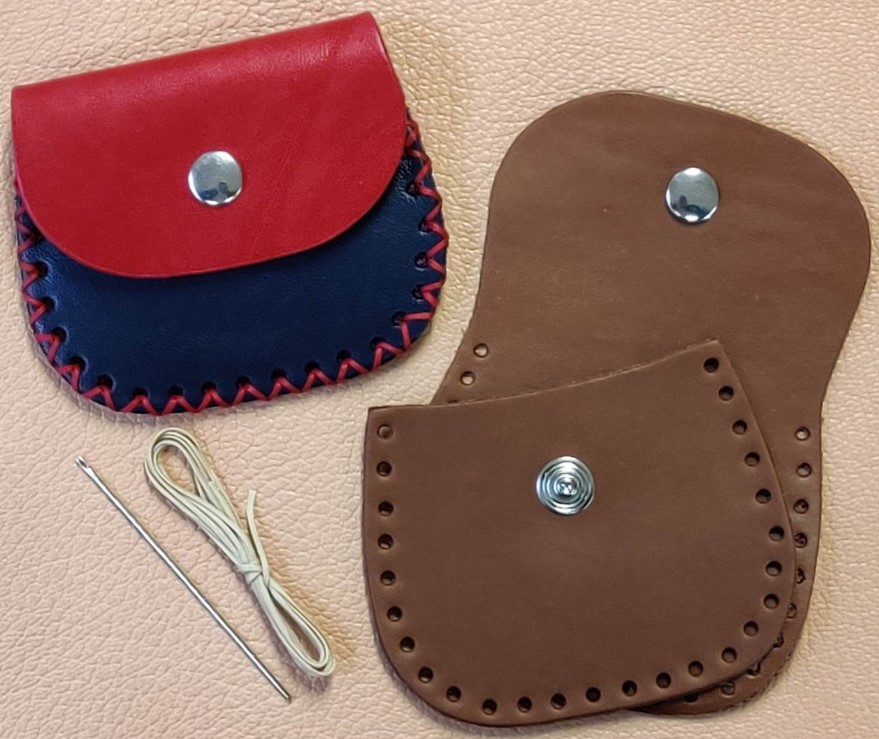 Bastelset: Portemonnaie 2-teilig, pflanzlich gegerbtes Leder, alle Teile punzierbar. Inhalt: 2 Stanzteile mit Druckknopf, eine Nadel, Garn und Anleitung