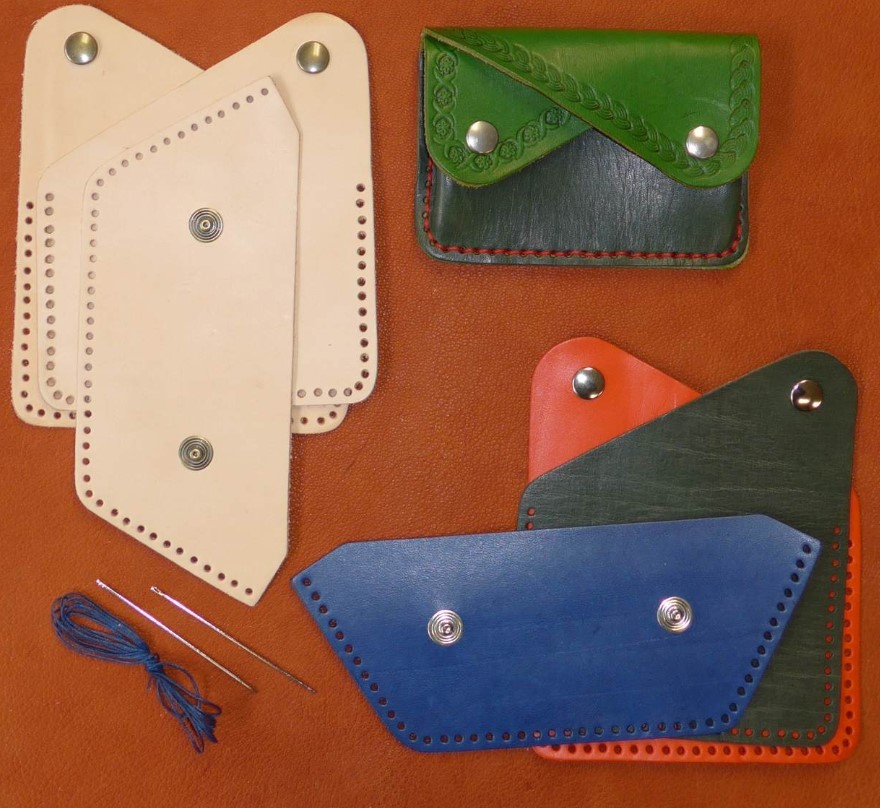 Bastelset: Portemonnaie 3-teilig, pflanzlich gegerbtes Leder, alle Teile punzierbar. Inhalt: 3 Stanzteile mit Druckknopf, eine Nadel, Garn und Anleitung