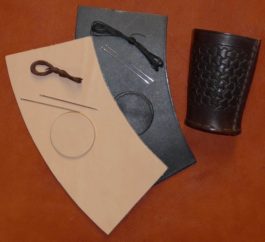 Bastelset: Knobelbecher, pflanzlich gegerbtes Leder, punzierbar. Inhalt: 2 Stanzteile mit Anleitung für die Löcher, 2 Nadeln und Garn