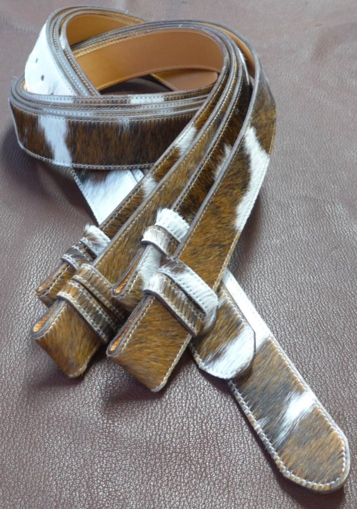 Die Kuhfellgürtel gibt es in 30, 35 und 40 mm Breite, sie sind kaschiert und abgesteppt und haben noch keine Schnalle. Die Schnalle zum Gürtel können Sie frei wählen!