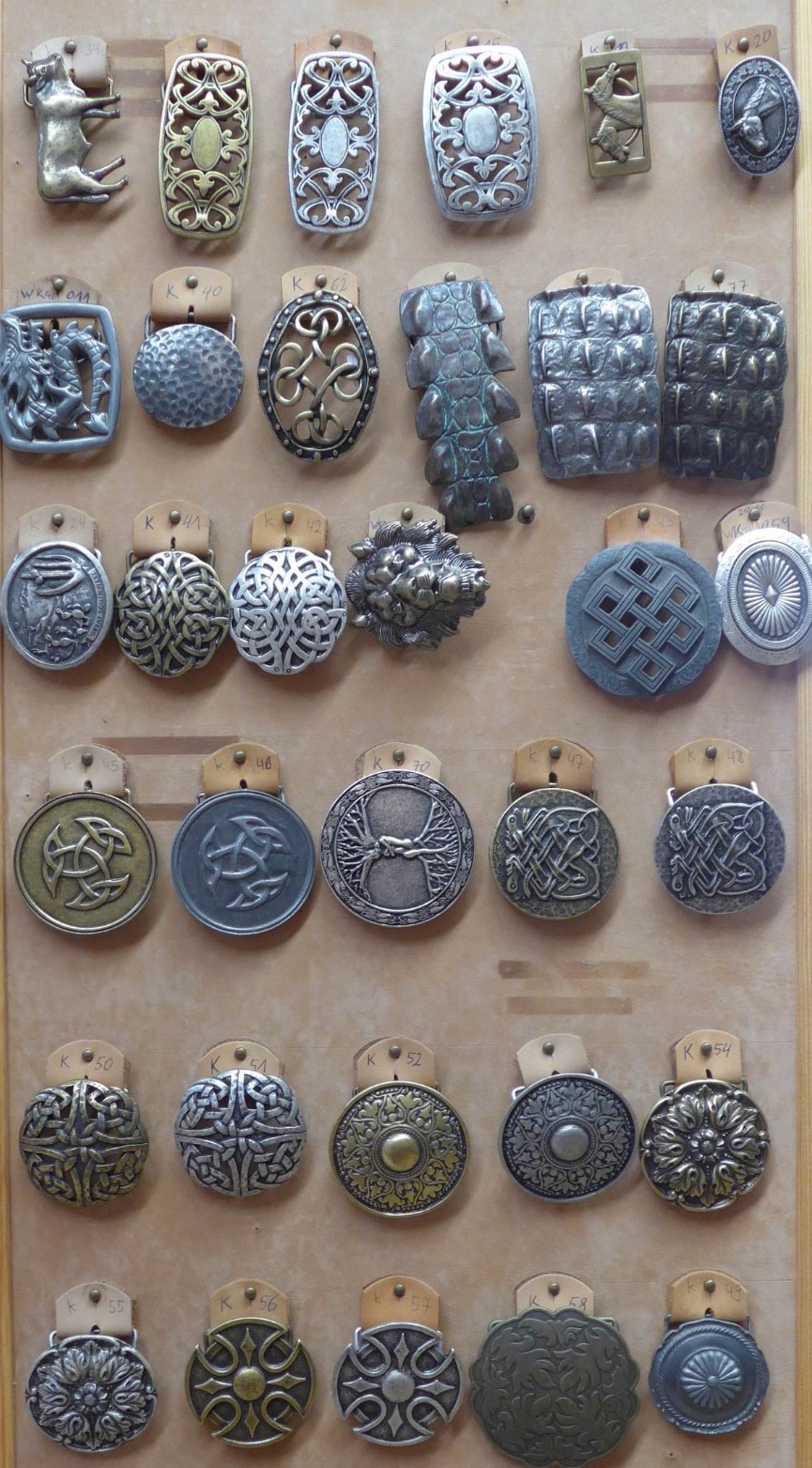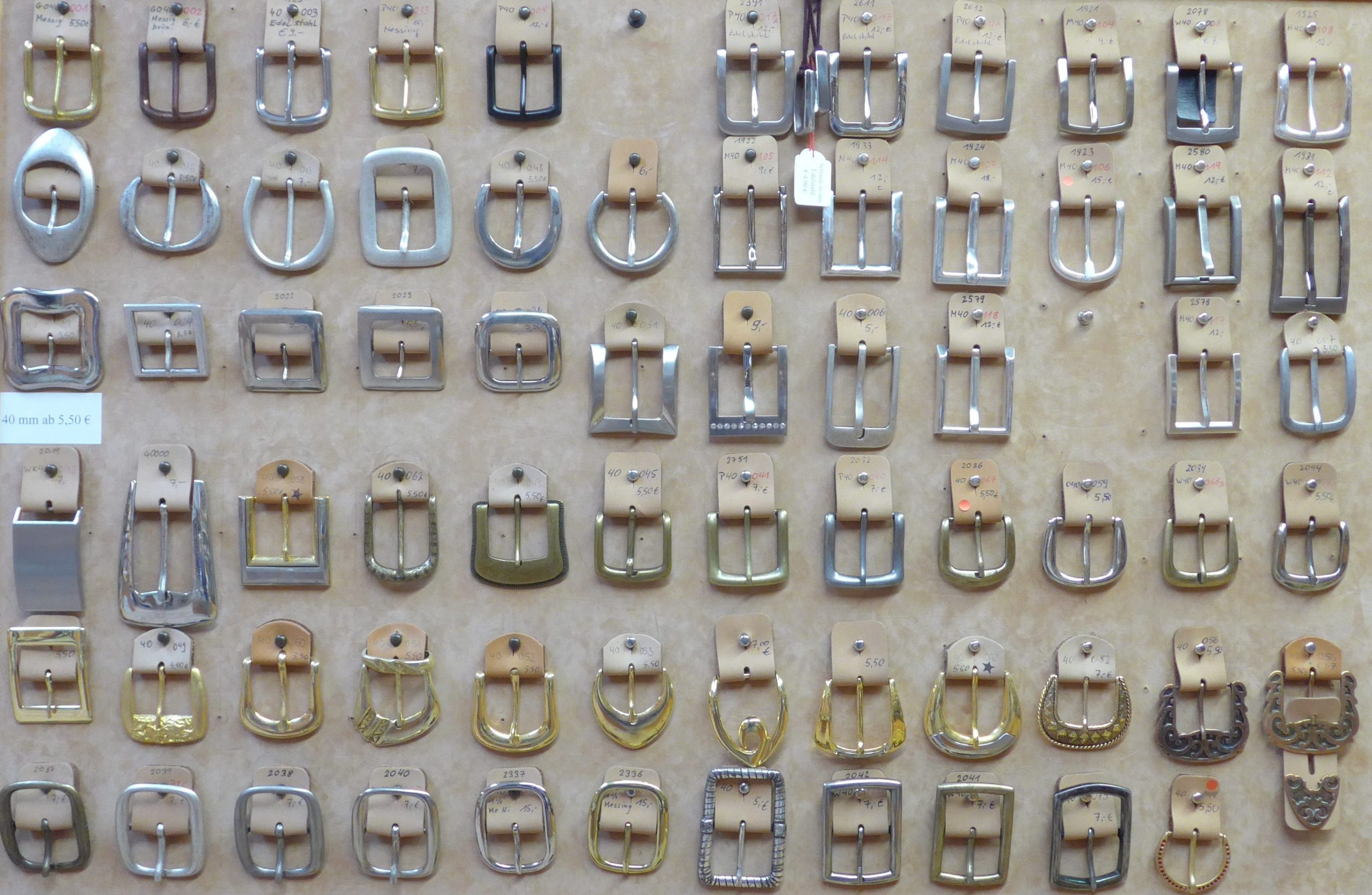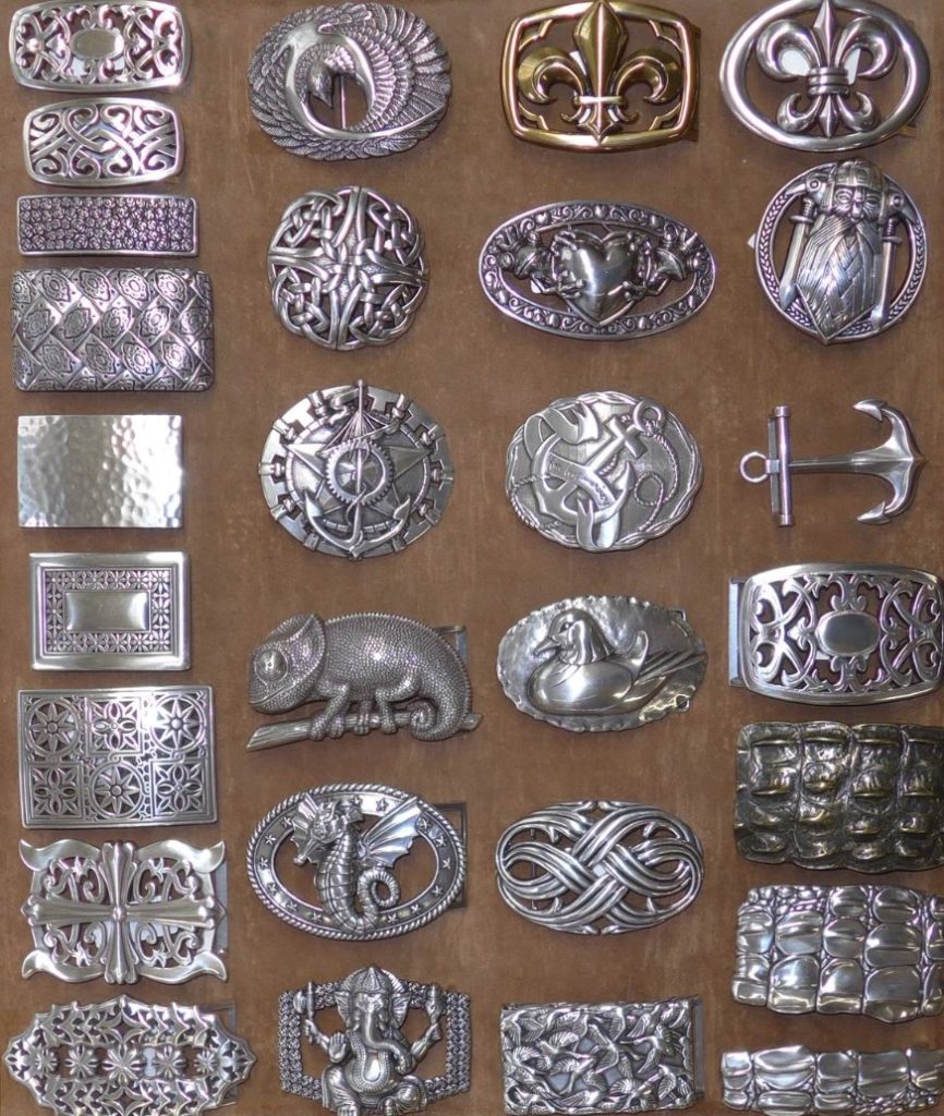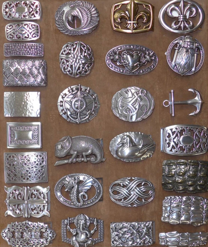 Viele dieser 4.0 cm breiten Schnallen haben wir fest in unserem Sortiment, können nachbestellt werden, einige sind Einzelstücke, da ist die Menge begrenzt. In der oberen Reihe sehen Sie Schnallen aus Messing und Edelstahl, die mittleren Doppelschnallen in der unteren Reihe sind ebenfalls aus Messing, alle anderen Schließen sind aus ZAMG (Zinkdruckguss), in verschiedenfarbigen Oberflächen.