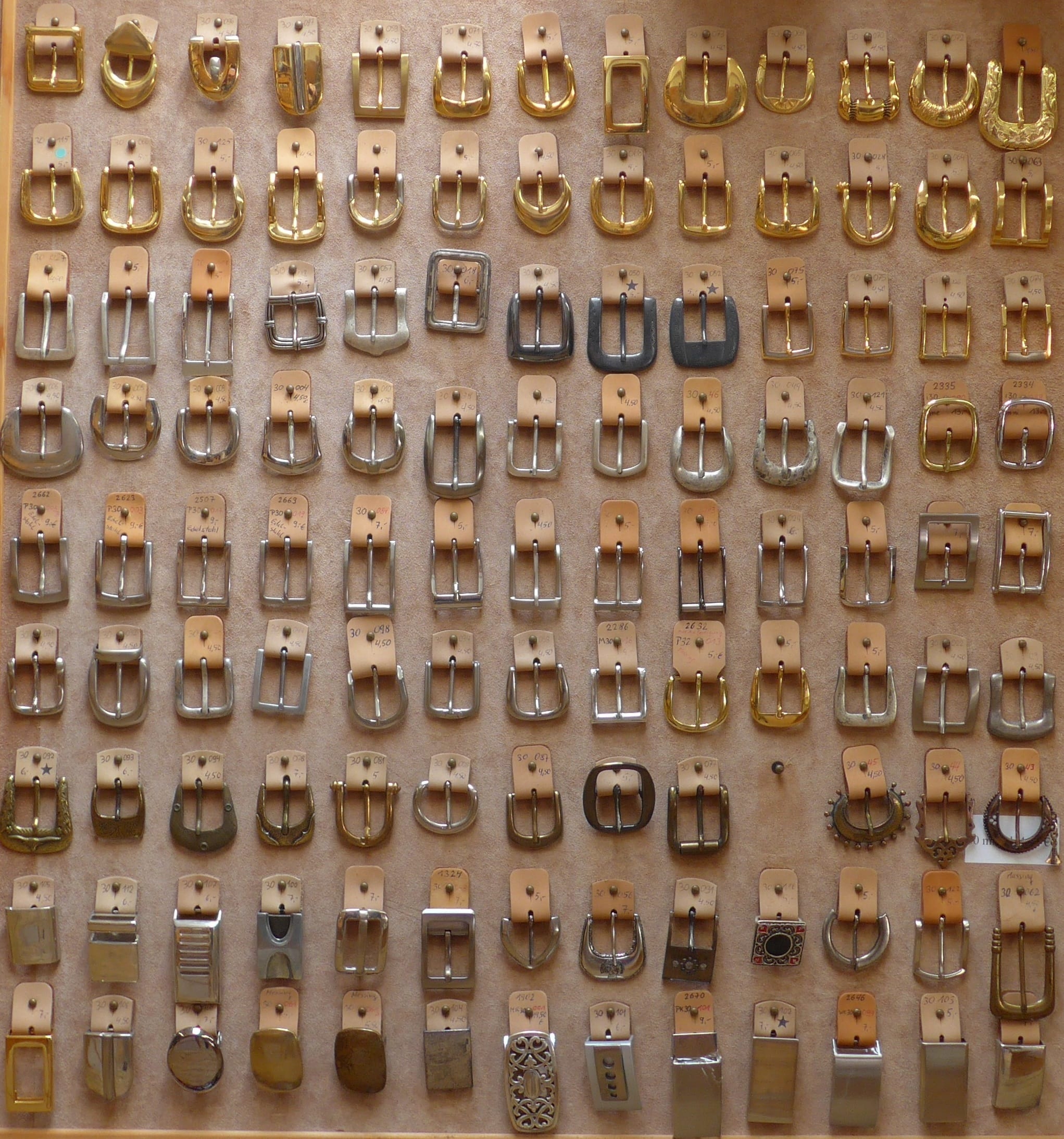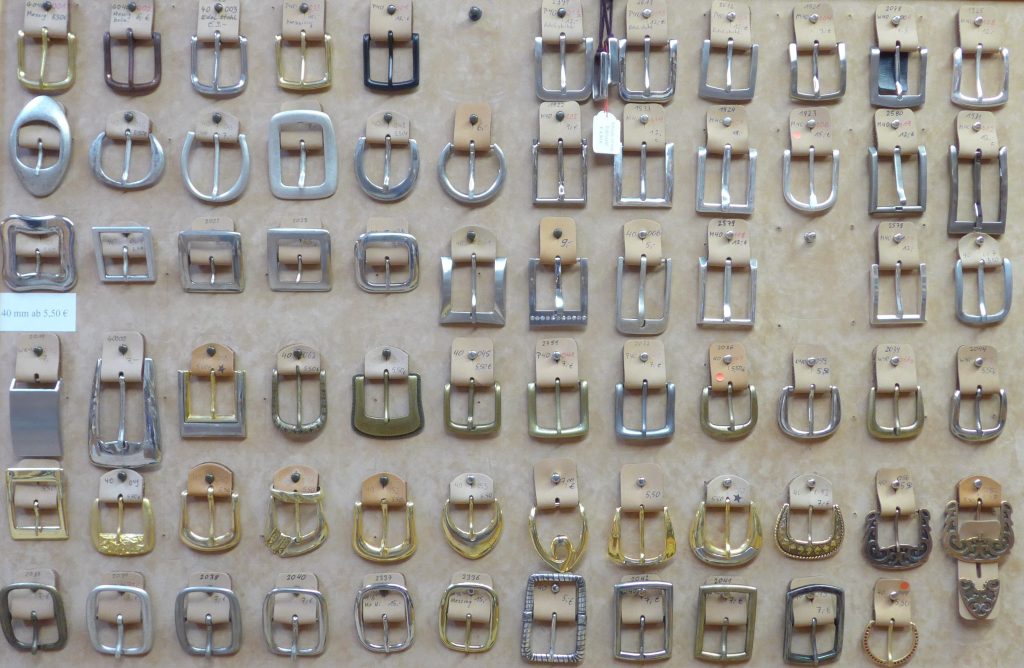 Die Auswahl an 3.0 cm breiten Schnallen sind vorwiegend aus ZAMG (Zinkdruckguss), in verschiedenfarbigen Oberflächen. In der vierten Reihe sind die beiden Doppelschnallen, ganz rechts, aus Messing und eine Reihe darunter, sind die ersten vier Schließen aus Edelstahl. Manche Schnallen haben wir fest im Sortiment, bei manche ist die Stückzahl begrenzt.