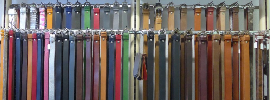 Dies ist unser Gürteltresen mit Gürteln in den Breiten: 2,0 cm, 3,0 cm, 3,5 cm und 4,0 cm. Die Gürtel haben noch keine Schnalle, was Sie sehen, ist nur die Aufhängung. Die Schnalle zu dem Gürtel suchen Sie sich aus unserem Angebot aus oder Sie haben bereits eine Schnalle, die einen neuen Riemen bekommen soll.