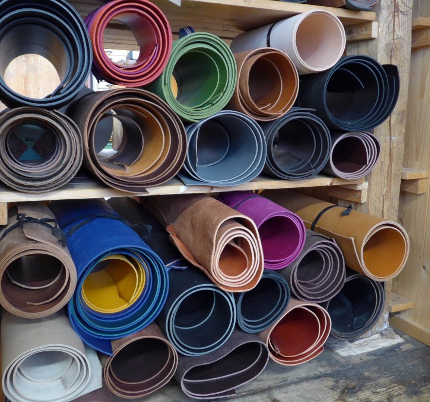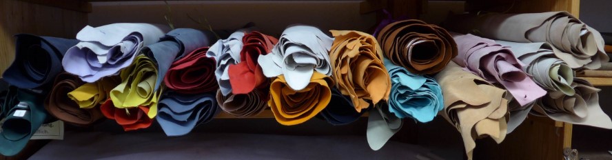 Täschner- und Oberleder, in verschiedenen Qualitäten, glatt und mit Oberflächenstruktur in vielen Farben. Daraus lassen sich hervorragend Taschen nähen.