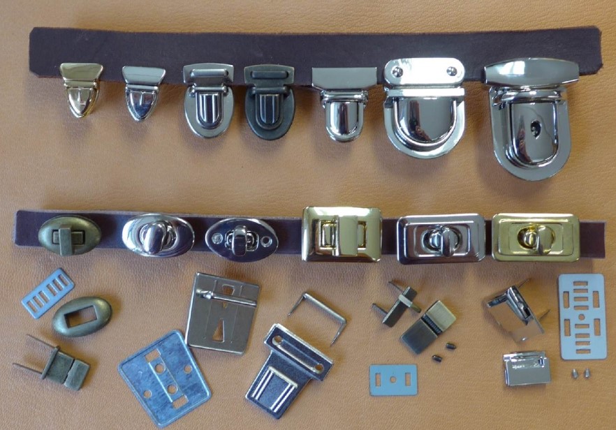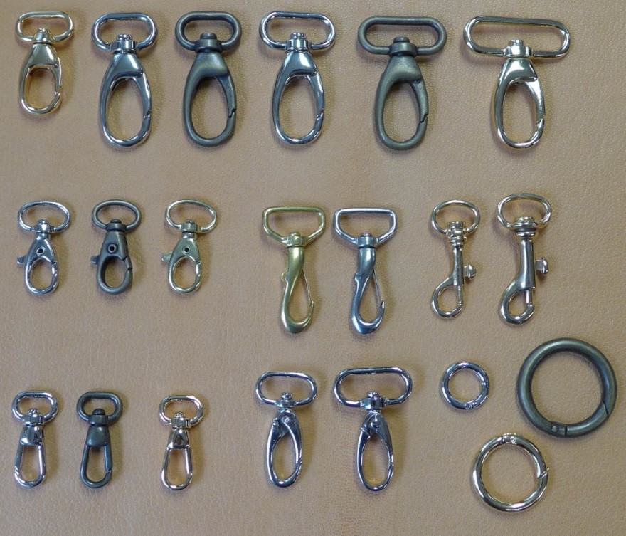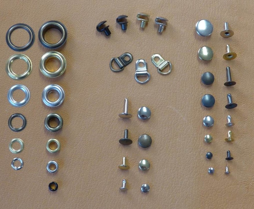Ösen in 4, 5, 6, 8, 10, 12 und 15 mm Innendurchmesser. Doppelkopfhohlnieten in vier verschiedenen Größen, Hohlnieten in acht. Agraffen und Schuhhaken. Das Zubehör ist aus Eisen, zum Teil auch in massiv Messing vorrätig. Die Oberflächen sind in den Farben Nickel, Messing, Alt Messing oder brüniert.