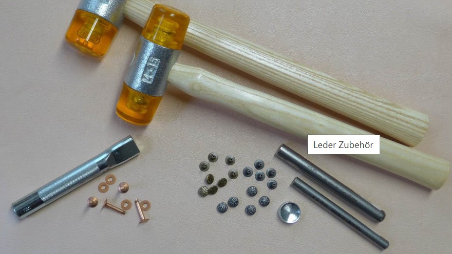 Wir haben 9/9 Nieten in Altmessing und Brüniert, mit dekorativer oberfläche, Werkzeug zum Nietensetzen mit Amboss und Hammer.