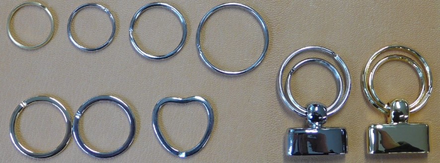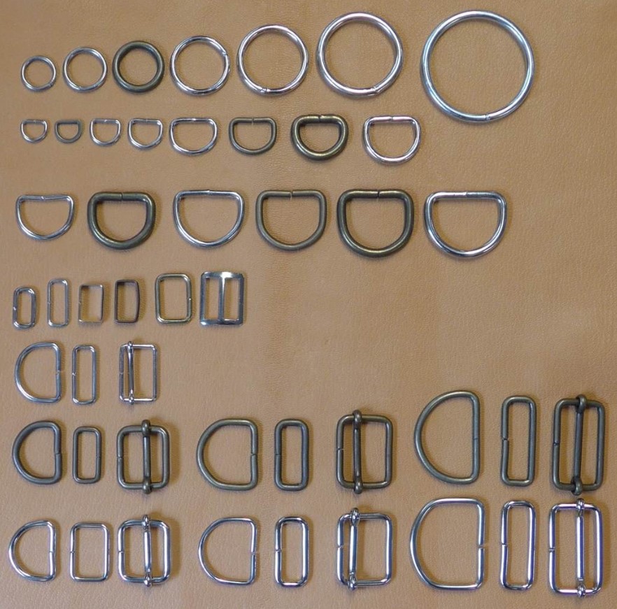 Ringe, 15 bis 50 mm Ø, z.T. geschweißt D-Ringe oder Halbring, 10 mm bis 50 mm Breite, Schlaufen, 12 x 6 mm bis 50 x 10 mmm Set, D-Ring, Schlaufe und Schieber, für z.B. Taschenriemen, 25 bis 50 mm Breite. Zubehör aus Eisen in den Farben Nickel oder Altmessing