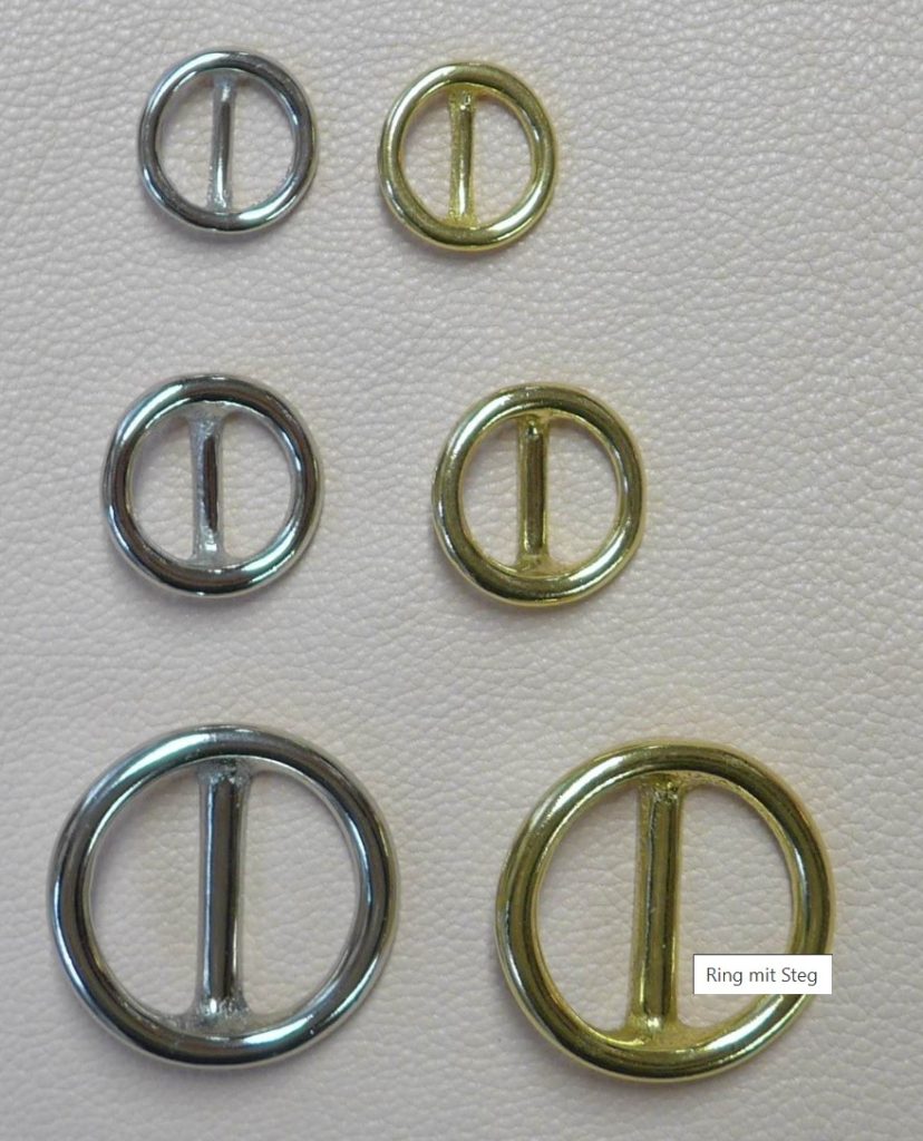 Ringe mit Steg in drei Größen: 1/2'', 5/8'' und 1'', aus Messing und Messing vernickelt. Verwendung finden diese Ringe in der Herstellung von Hundehalsbänder, als Stopper.