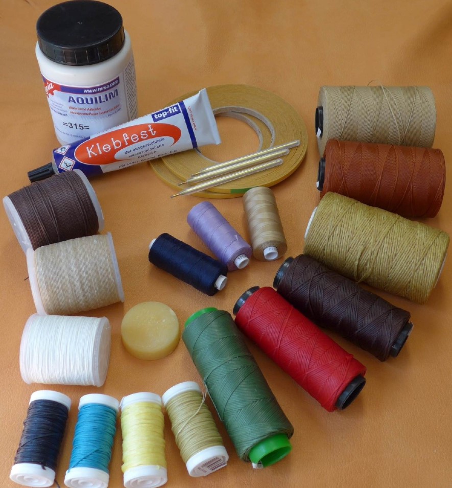 Polyestergarn in verschiedenen Stärken und Spulengröße , Kunstsehne flach oder rund, Leinengarne roh oder gewachst, Nähwachs, Polyestergarn für die Nähmaschine in unterschiedlichen Dicken und breiter Farbpallette, Silbermine, zum Anzeichnen auf Leder, doppelseitiges Klebeband, Lederkleber