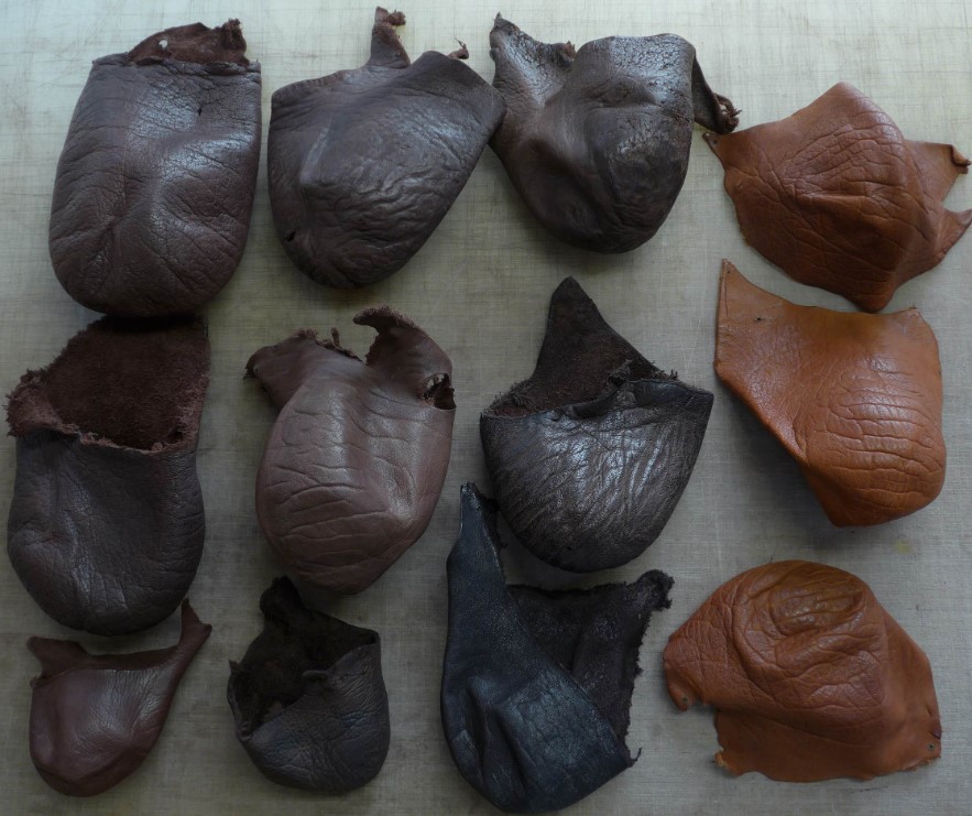 Damhirschleder, sämisch gegerbt, geschliff, 1,5 - 2 mm dick, ca. 0,8 - 1,1 m² groß, zwischen 15,- € und 22,- €. Abbildung 15,-€