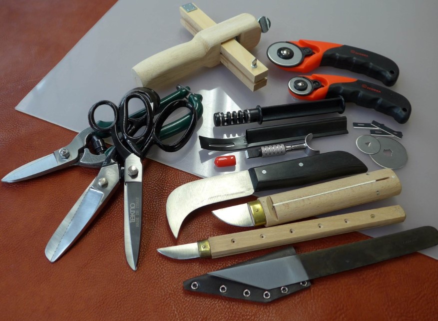 ... zum Schneiden: Scheren, div. Sattlermesser, Rollmesser, Ersatzklingen, Safety Beveler, Lederhobel, Lace Maker, Riemchenschneider, Riemenschneider, Schneidunterlage