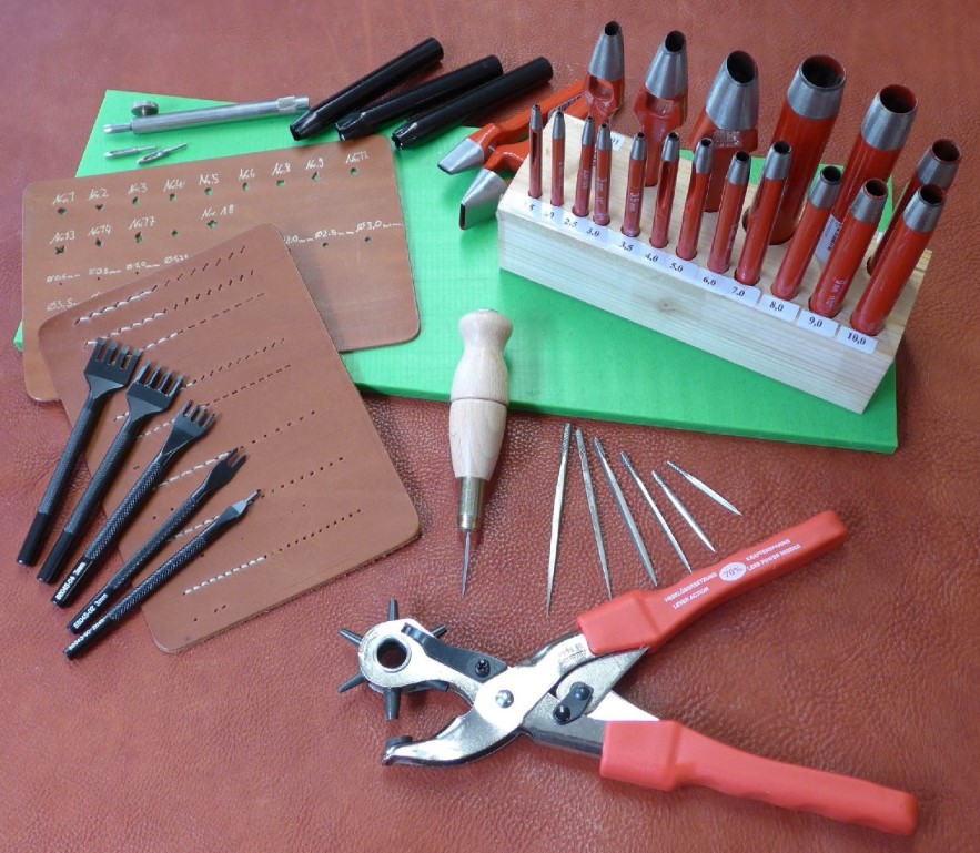 ... zum Lochen: Revolverlochzange, Chisel in verschiedenen Größen, Ahlenheft mit Ahlen, div. Loch- und Formlocheisen, Perforiernadeln, Stanzunterlage
