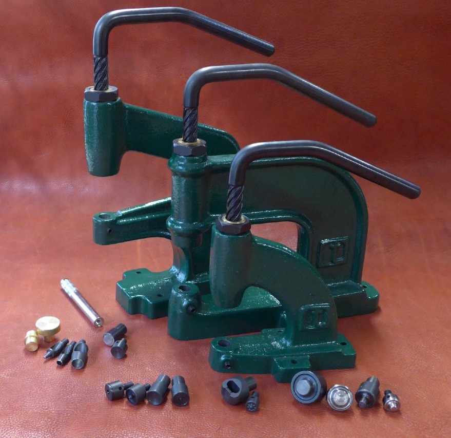 … zum Nieten, Lochen, Setzen von Ösen, Agraffen und Druckknöpfen: Hand-Spindelpressen, Spindelpressenwerkzeuge in verschiedene Größen für verschieden große Nieten, Ösen, Agraffen und Druckknöpfe, Hand-Schraubgriff