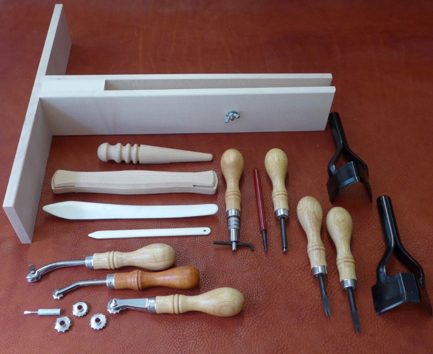 …zur Bearbeitung von Leder: unterschiedlich große Prickräder für den Nahtabstand, Reifeleisen und - holz, Falzbeine, Polierholz für Lederkanten, Nähpferd, div. Rillenzieher, Kantenzieher in zwei Größen, Gürtelspitzen - Abschläger in eckig und rundspitz