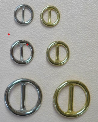 Ringe mit Steg in drei Größen: 1/2'', 5/8'' und 1'', aus Messing und Messing vernickelt. Verwendung finden diese Ringe in der Herstellung von Hundehalsbänder, als Stopper.