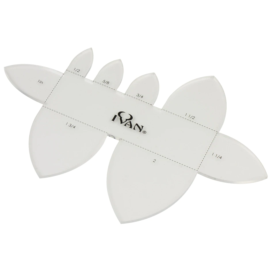 Mit dieser Schablone lassen sich leicht, symmetrisch spitzzulaufende Riemenende anzeichnen. Für eine Riemenbreite von ca. 1,3 cm (1/2“), 1,6 cm (5/8“), 1,9 cm (3/4“), 3,8 cm (1 1/2“), 2,5 cm (1“), 3,1 cm (1 1/4“), 4,4 cm (1 3/4“) und5 cm (2“)